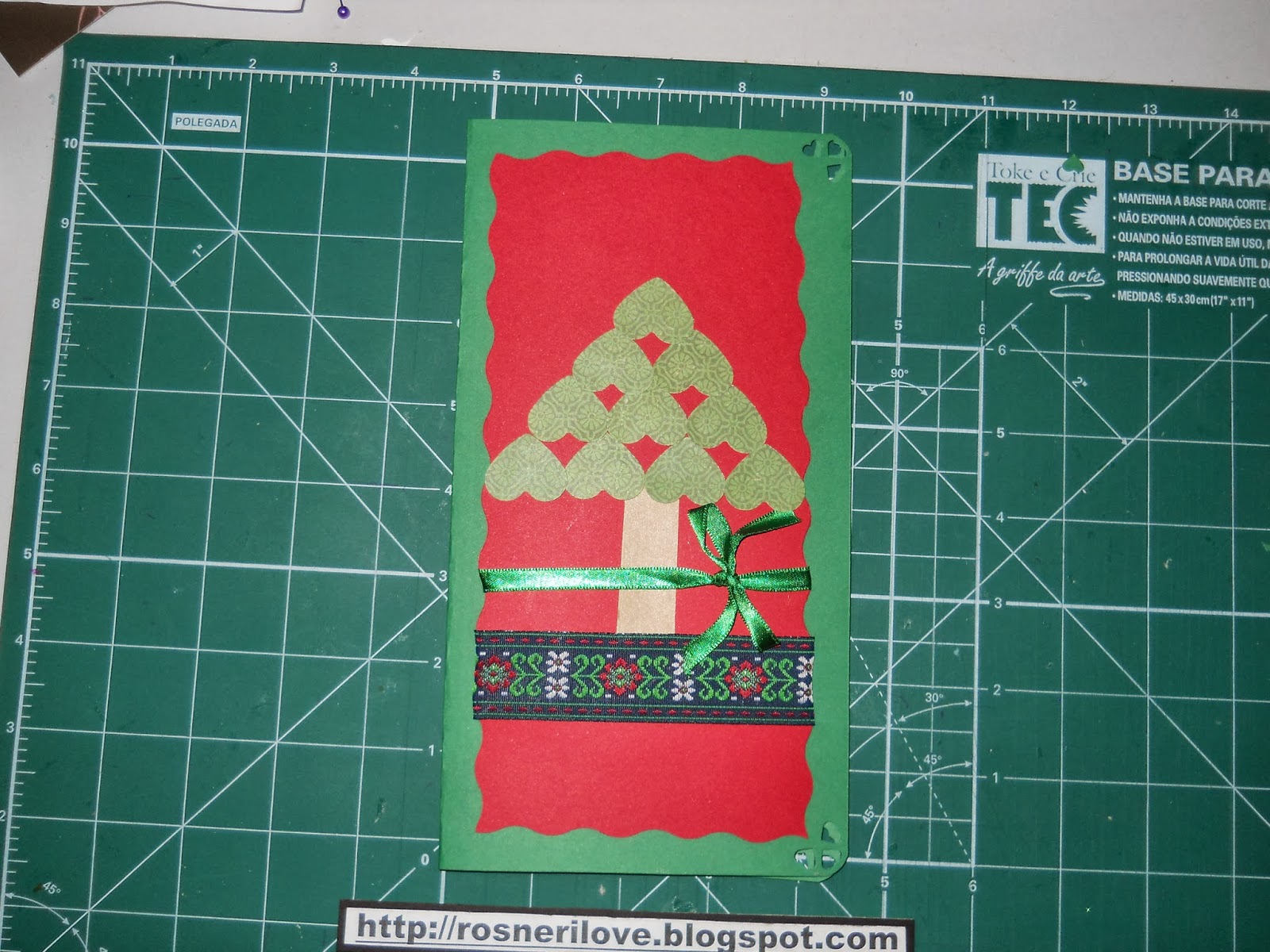 Depois de colar fita mimosa e grega ,aplique o retângulo vermelho no seu cartão...