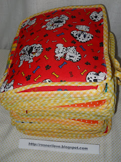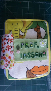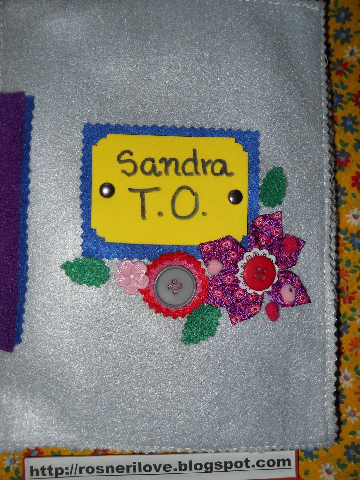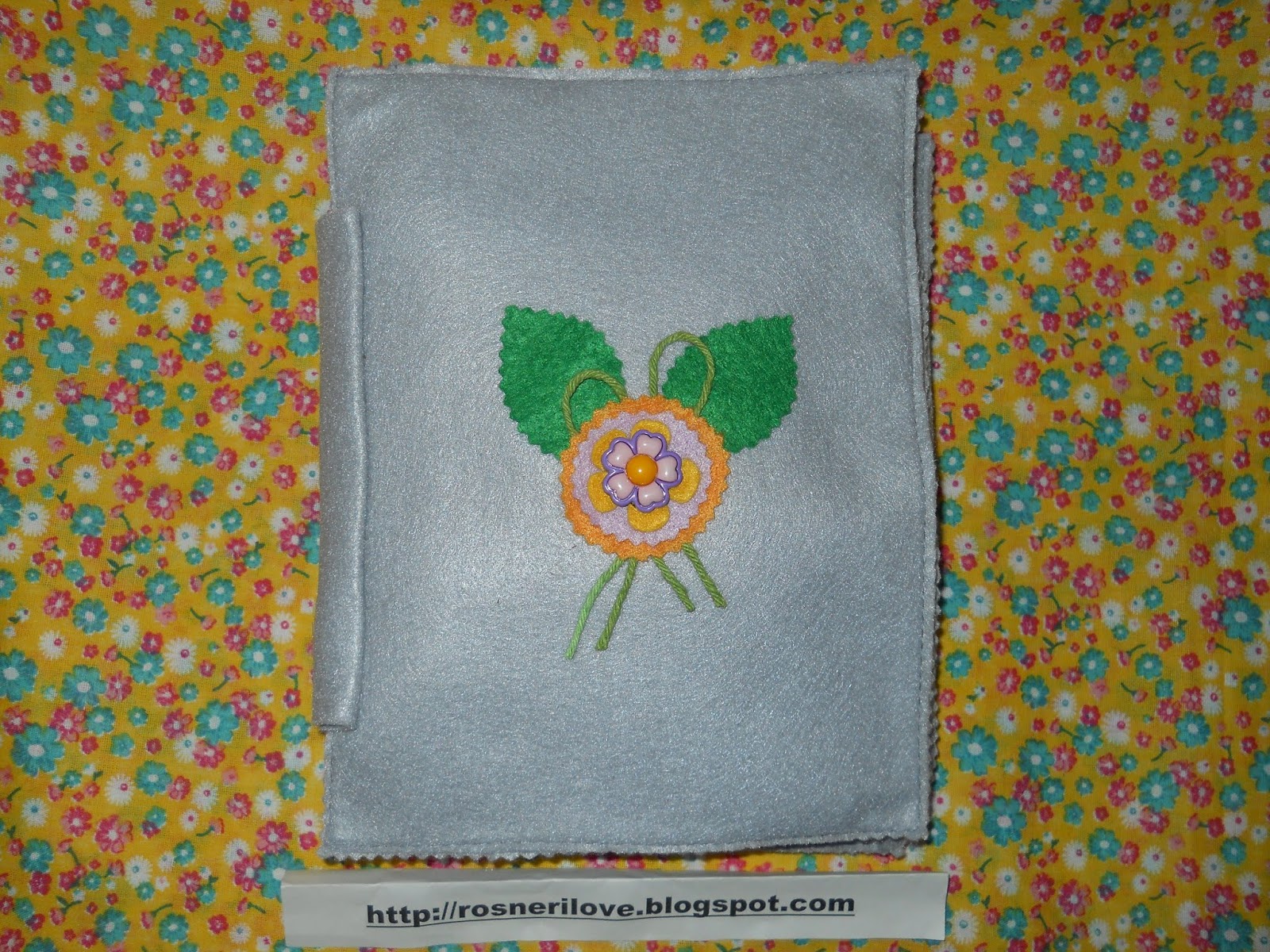 Capas em detalhes em EVA sobreposto no feltro e encadernação de argolas.